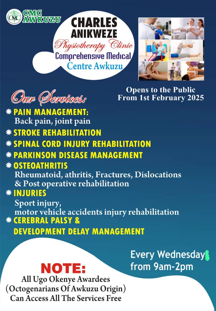 • Charles Anikweze physiotherapy Clinic opens to the public from 1st February, 2025.